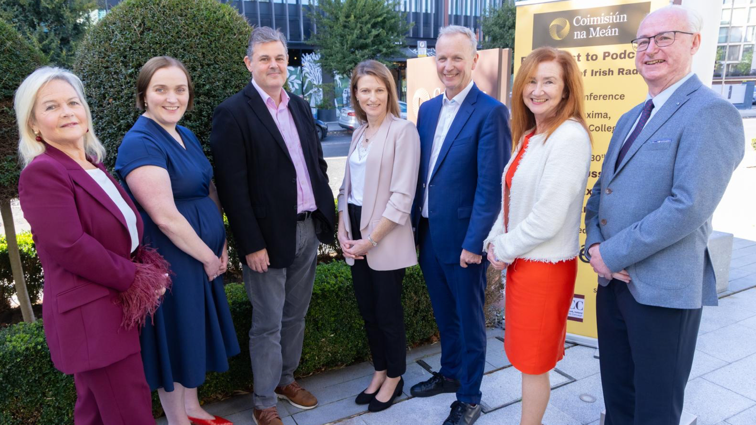 Photo: Dr Finola Doyle O’Neill – Broadcast and Legal Historian, School of History, University College Cork (organiser), Patricia Monahan – Director of Audio RTÉ, Kevin Bakhurst – DG RTÉ, Clare Diamond – Coimisiún na Meán Director of Broadcasting & VoD, Matt Cooper – Broadcaster at Today FM, Aoife Mac Evilly – Coimisiún na Meán Broadcasting and Video-on-Demand Commissioner, Michael Kelly – Chief Executive of the Independent Broadcasters of Ireland.